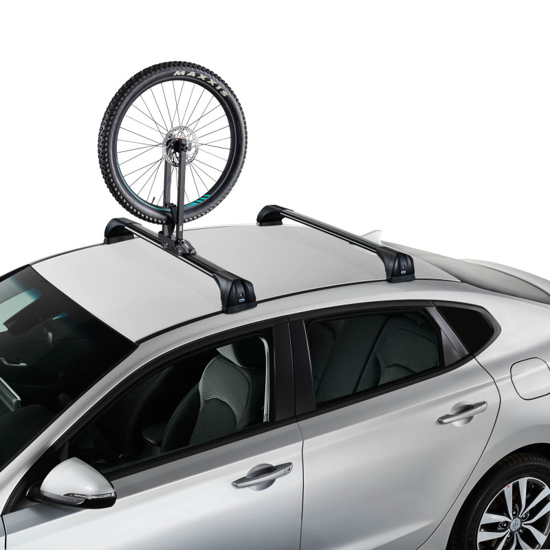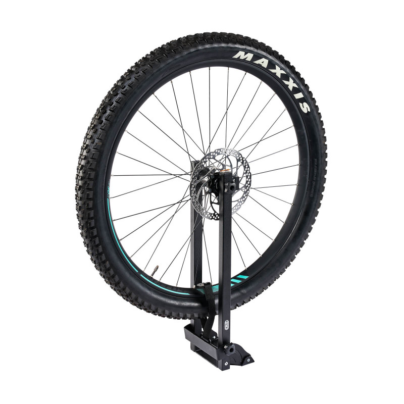 Roof wheel carrier compatible with most front bicycle wheels. Its design makes it compatible with both normal and thru axles as well as with most disc brakes. The wheel carrier folds to lower height and reduce wind resistance when not in use. Easy to be fitted around the bars as well as directly to the T-tracks of aluminium bars.